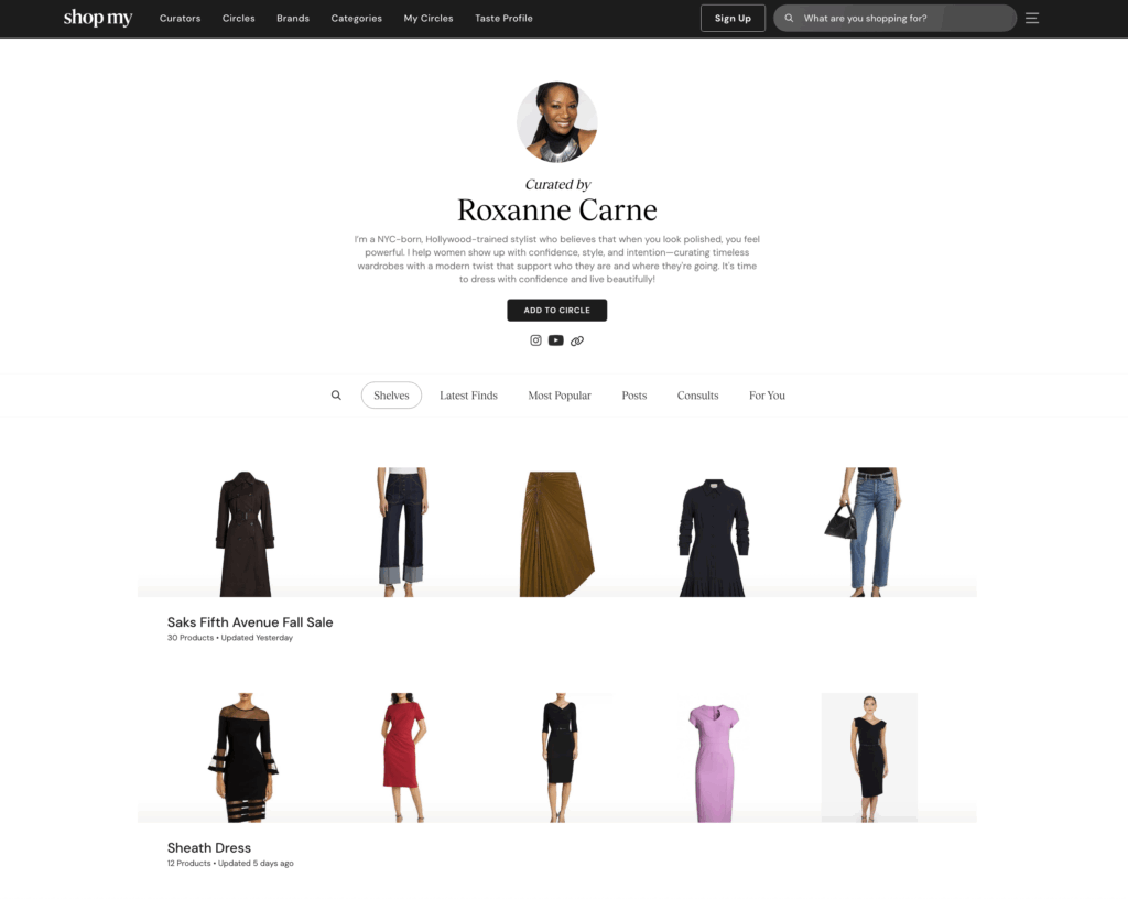 - Curated Discovery. See full outfits and themed shelves from stylists, creators, and boutiques — not random product pages.